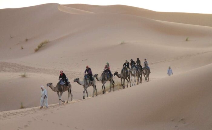 Arriving in Merzouga desert then join an incredible camel ride adventure through the lovely dunes of Merzouga admiring the amazing sceneries along the way. After that, stop to watch sunset over the dunes and then continue to your desert camp where you’ll spend a captivating night under stars.